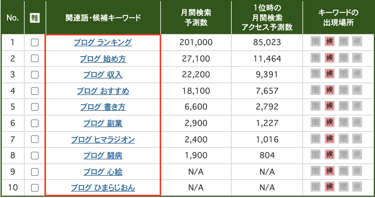 表示された関連キーワードの中から、記事にするキーワードを一つ選びます。
