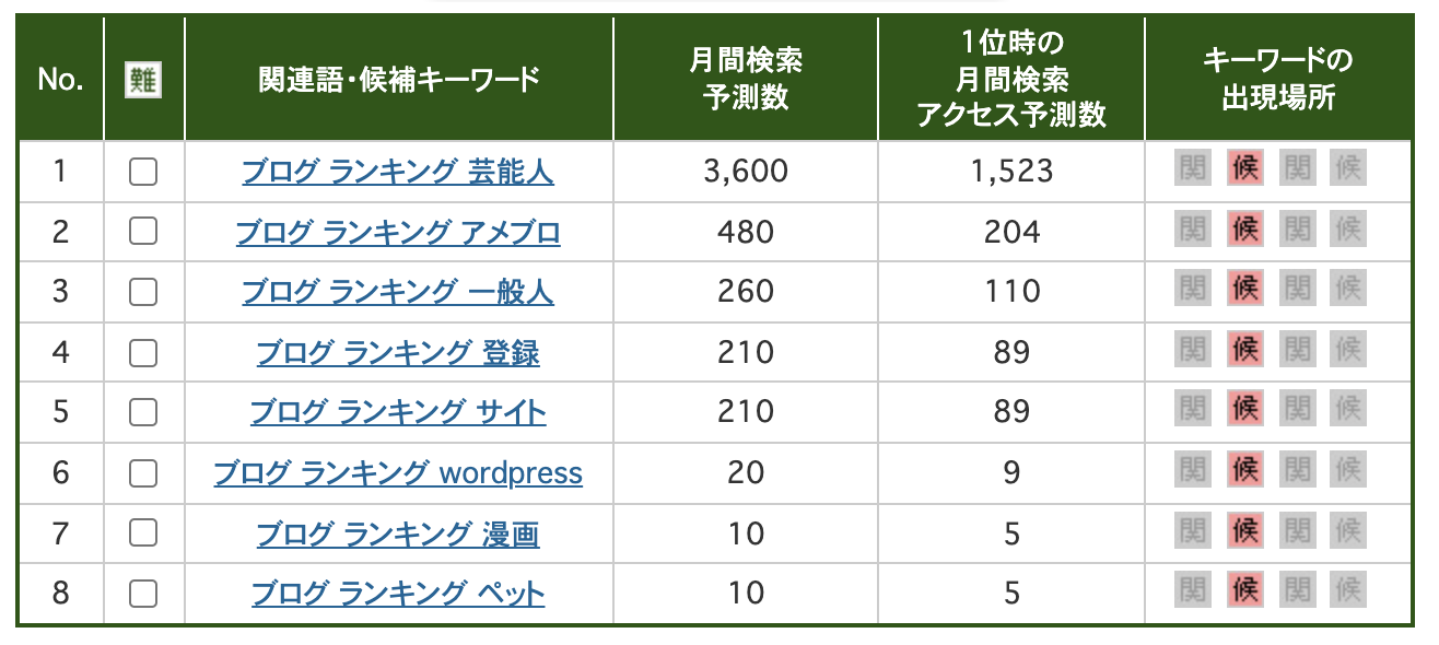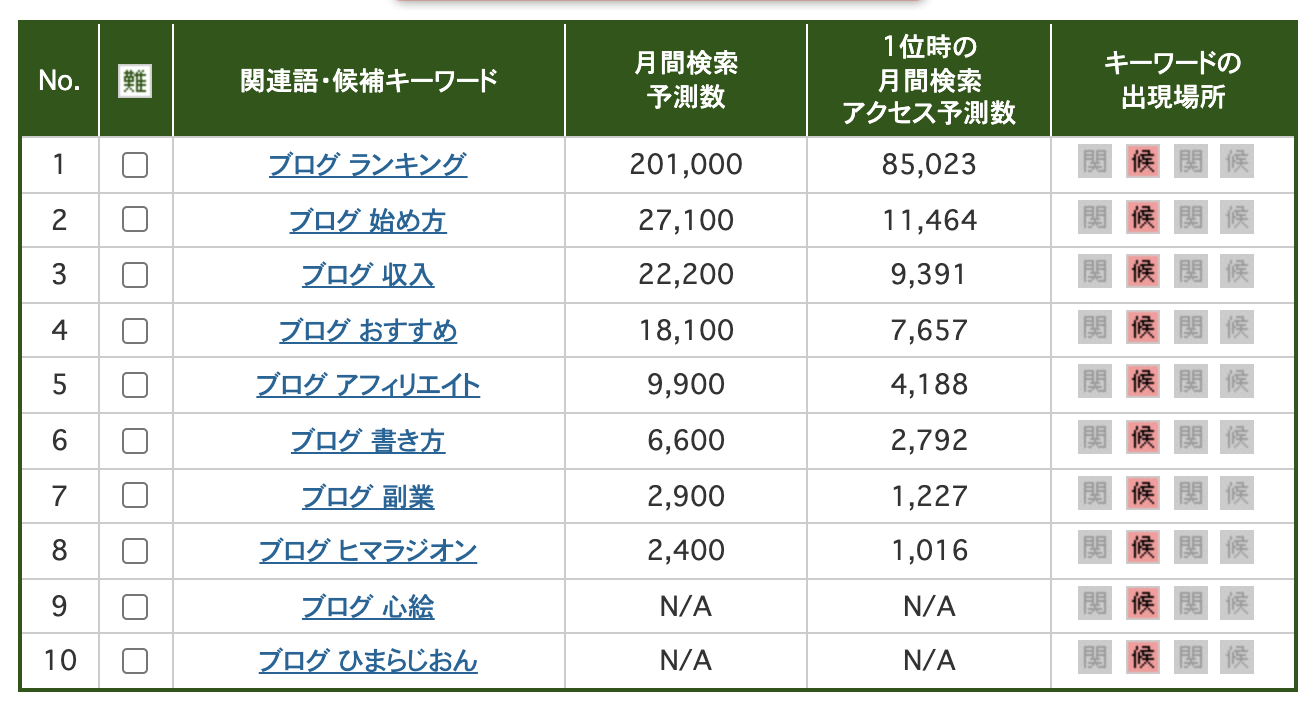 例)「ブログ ランキング」「ブログ 始め方」「ブログ アフィリエイト」...etc,
